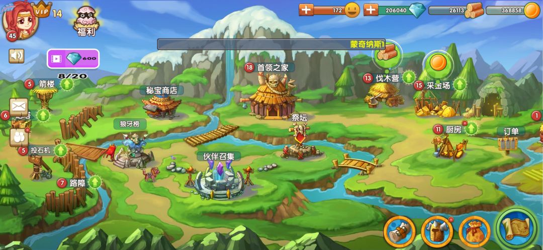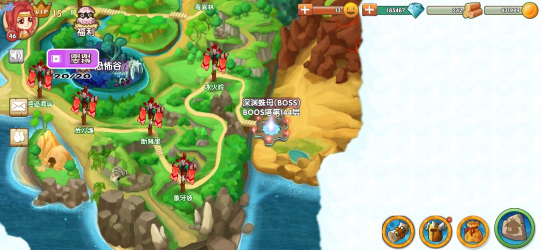 2.首领之家需要攒木头金币升级这个很重要前期主要升级,技能最好用的是祈祷药水强就完了,先打人任务关卡升级,由于截图上传有限制,合成装备拦里面紫色装备一般可以在勇闯商店里面刷到,这样可以节省体力,每天有二十个广告可以升级vip,vip越高体力、钻石、琅琊榜次数等等都有增加,说到琅琊榜的事了每天三次挑战可以领取经验,每天打榜升级有相应的钻石和红色宝珠奖励,宝珠可以在勇闯商店刷装备,还有一个神秘商店我要说下没什么用很浪费钻石资源,大家别去那里刷就行了,宝珠最好得到的地方是每天刷恐怖谷一共就关,到一定级别之后解锁地图boss塔,boss塔只给红色宝珠,淘宝港根据岛屿等级一个小时的金币产量不等,每天八点勇闯巅峰奖励丰厚新手一定别错过,每日21点还有琅琊榜结算。
