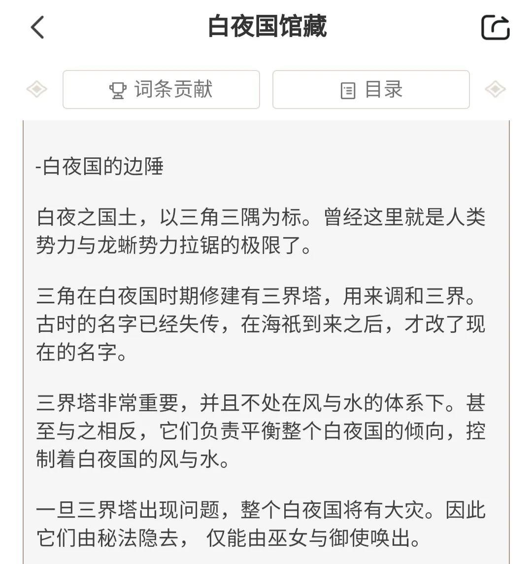 根据《白夜国馆藏(第三卷)》(白夜国地理水文考)所描述,白夜国的国土,以三角三隅为标。三角在白夜国时期建有三界塔,用来维持白夜国的平衡。一旦三界塔出现问题,便会出现大灾。(三界即人界、光界、虚无界。)