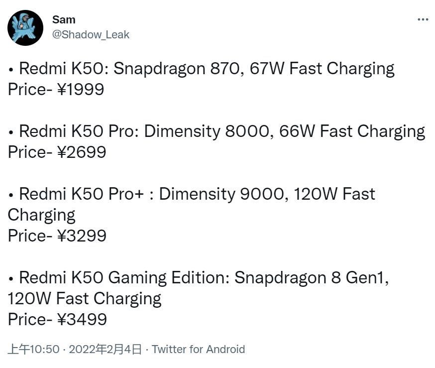 红米K50售价曝光:采用8Gen1的电竞版 售价高达3499元