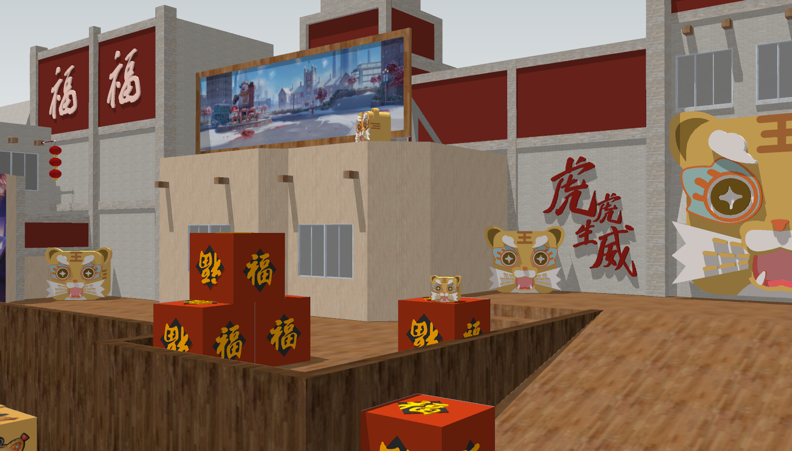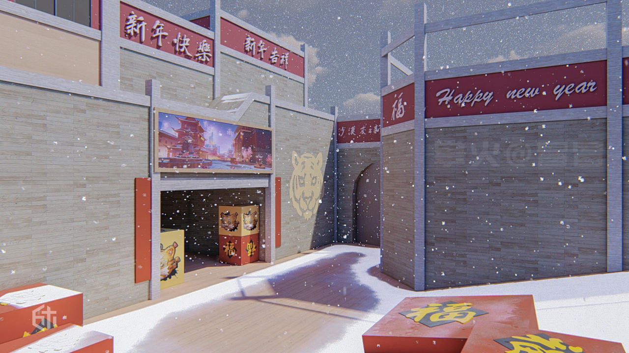 首先沙漠灰和新年广场的材质是完全不一样的,地图建筑的风格也是不同的。就需要提取新年广场的元素,然后再对沙漠灰的房子进行翻修改造。