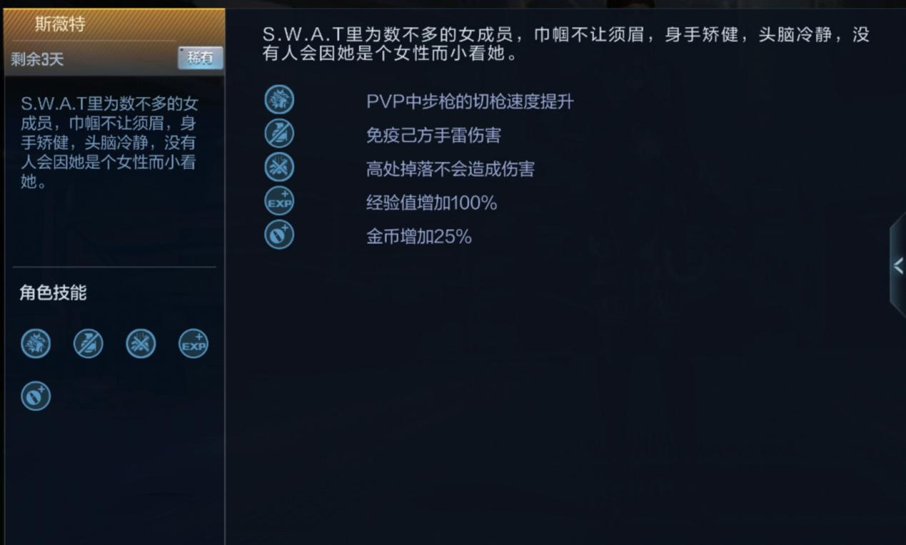 斯薇特有着PVP中步枪的切枪速度提升、免疫己方手雷伤害、高处掉落不会造成伤害这三大属性,同时又着100%的经验值加成和25%的金币加成。虽然说在属性方面斯薇特妹妹不一定比得上那些英雄级角色,但是就实用性来说也并不差,防摔防雷加上加快切枪速度的属性在PVP中完全够用了,尤其是对于那些打步枪的玩家们来说更是恰到好处。