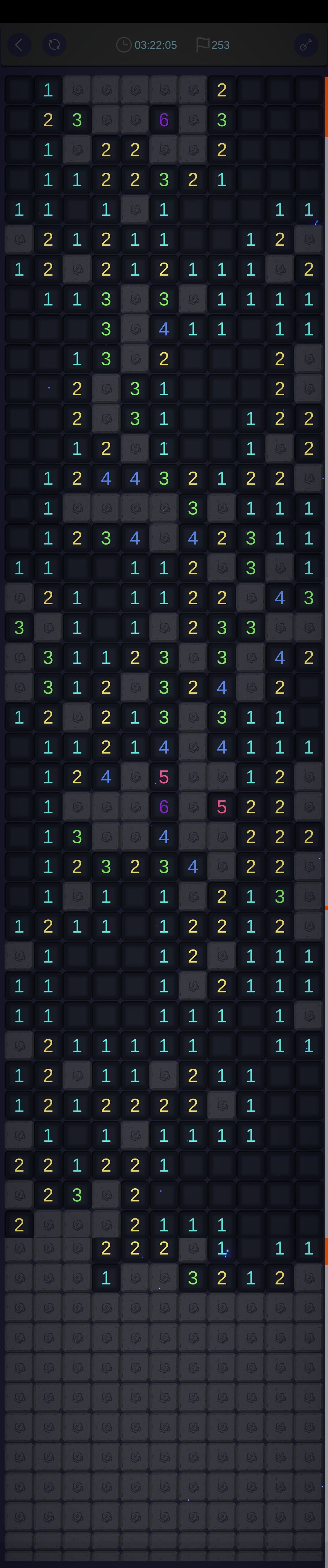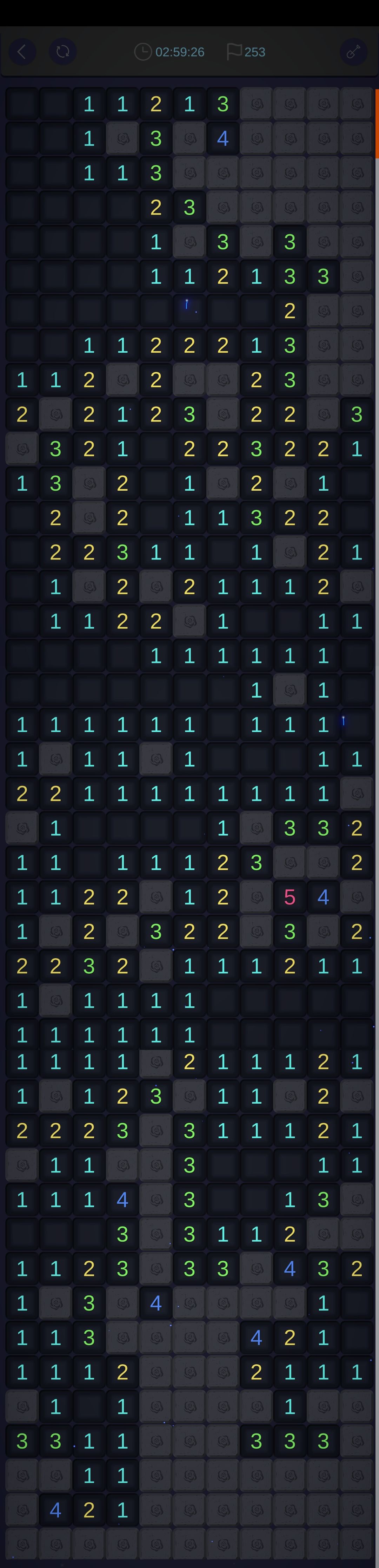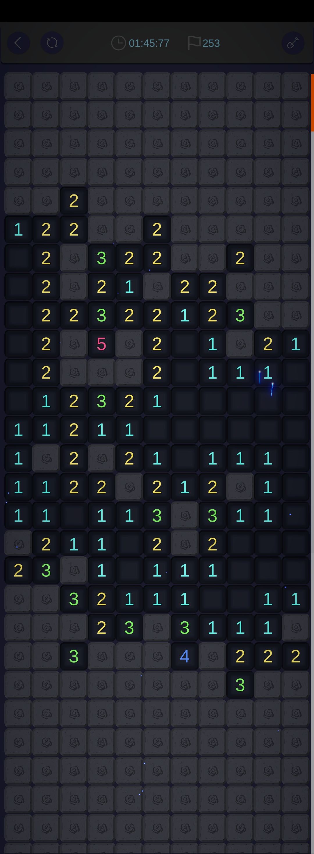 我觉得这款游戏作为扫雷游戏,猜雷的情况未免有些太多。毕竟因为手机的限制,左右宽度太窄,所以边缘墙体很长,导致更容易死局,只能靠猜。虽然有复活的选项,但对于那么多二选一、三选一作用不是很大。