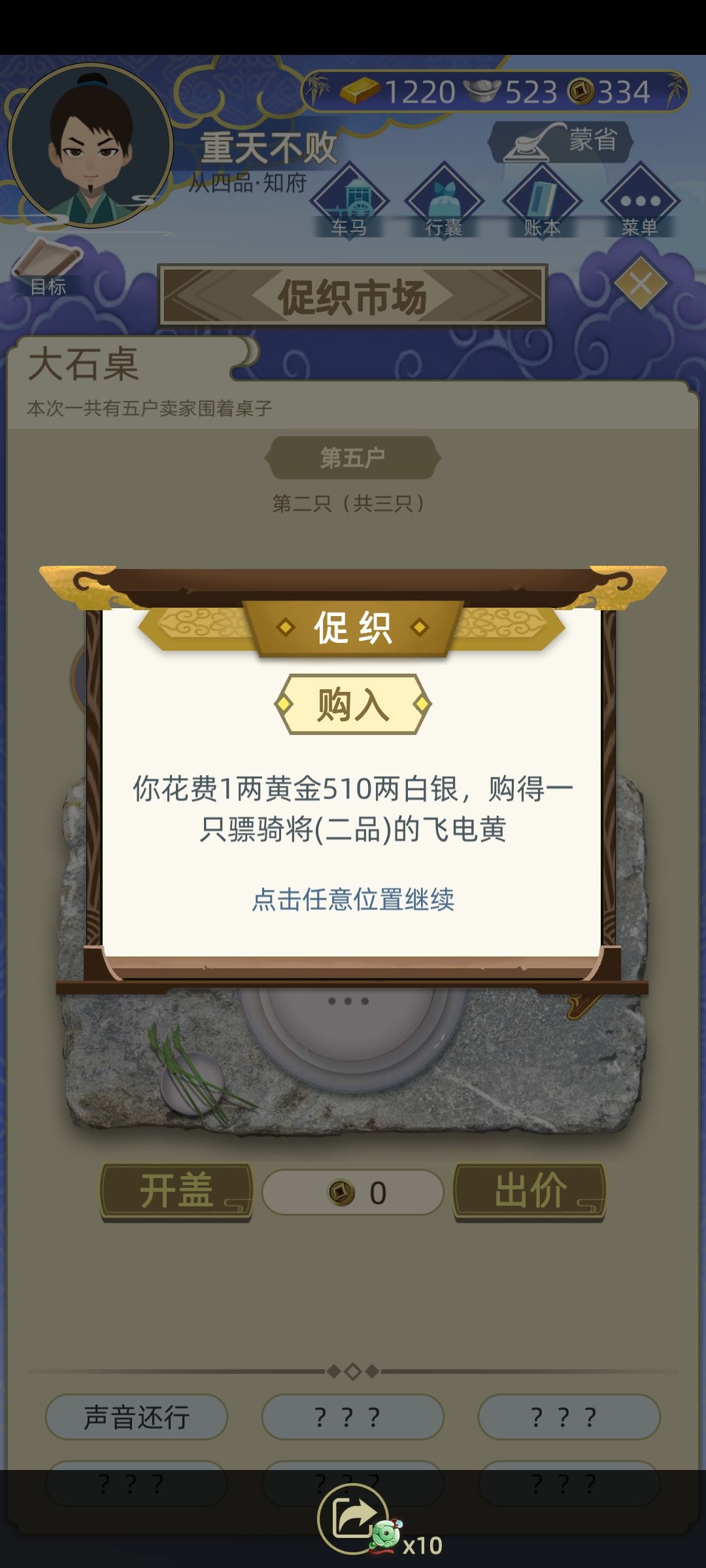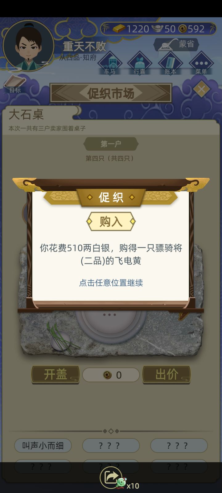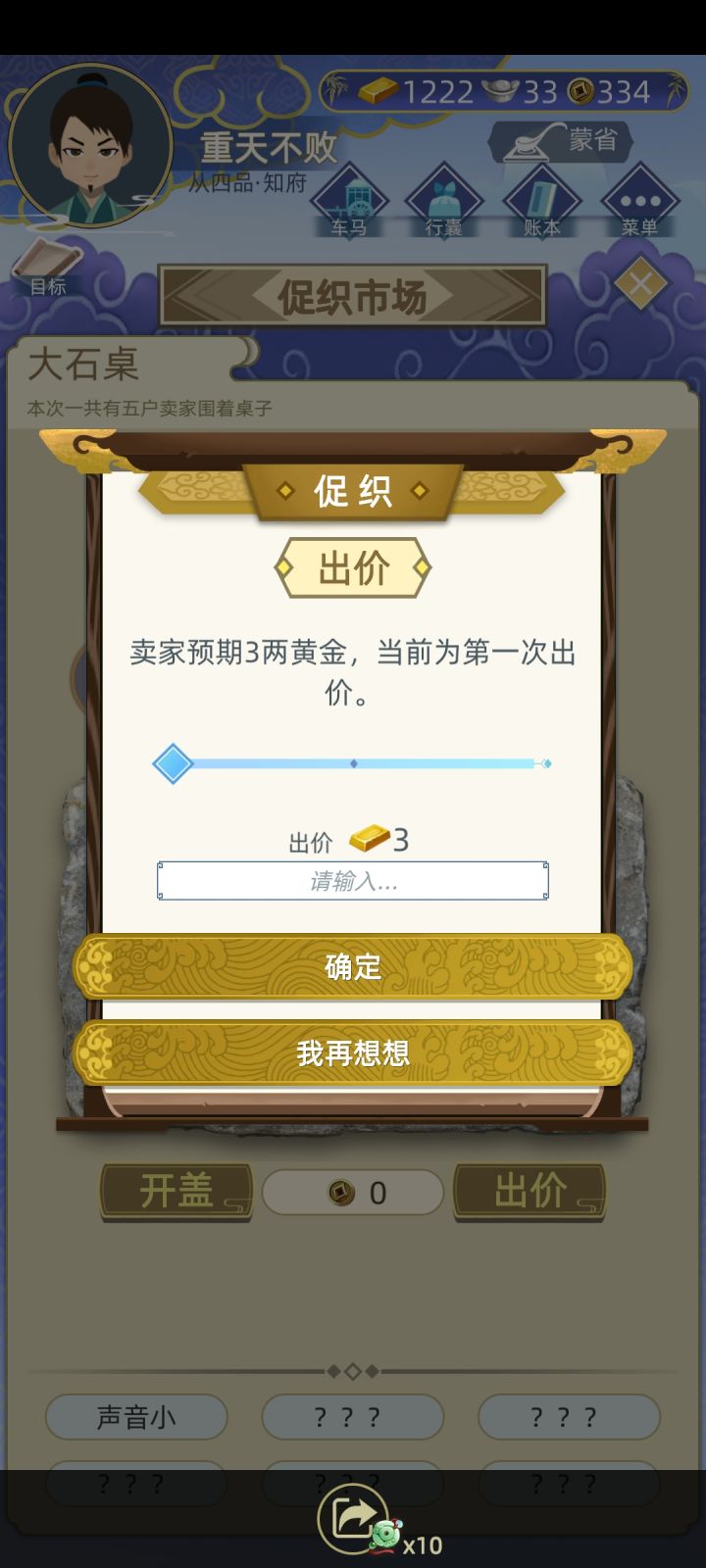写给有一点资产的新手的,可以通过倒卖促织赚取资金,钱多了些再炒房,种田。倒卖促织是稳赚不亏的,在促织市场里那个摆桌子,选一百两那个,有人会卖你促织,你可以还价,有很大概率出一品,二品的促织,技巧如下,比如他要十金,你可以五金加一百两就买,他要八金,你可以四金加一百两就买,总之就是他的要价除以2再加一点,要是正好是除以2人家是不会卖的,所以加点,这应该是最低收入价格了,你再倒卖的价格是高于你收入的价格的,这样买到的好促织可以用来打比赛或卖钱,对新手早期资产积累很有用。 最后,我也是最近才入坑的,不知是否有人已经提过这个技巧,反正希望对新手有帮助吧!
