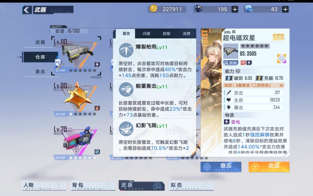 接下来我们看向他的普攻,他的别的都可以忽略掉,最重要的是爆裂枪雨,又被人们称作“双枪洗头”,拥有超高的倍率(图中为11级倍率可能会因为星级或等级影响)是镰刀脱手之后,驻场的不二选择。