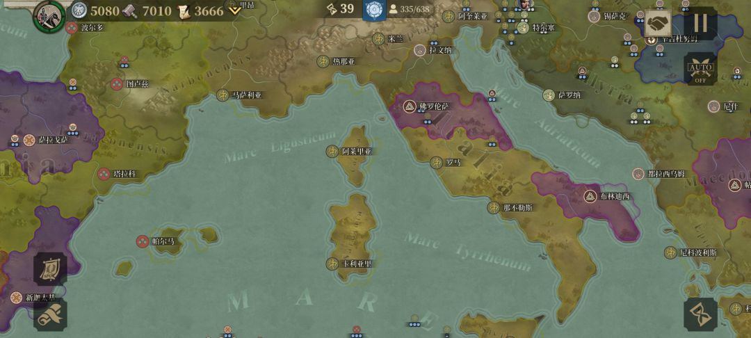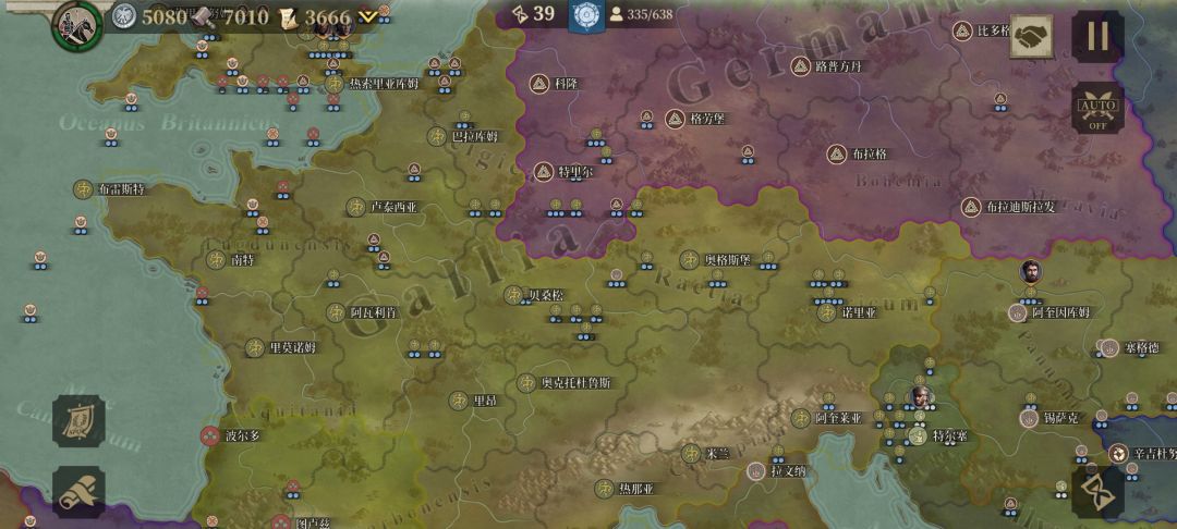 1、我已用了39回合,与高卢盟友灭了高卢地区亲罗马的两个高卢、一个日耳曼部落一个紧挨罗马的希腊城邦,然后灭了罗马 凯撒,之后我掉头灭了两个高卢、两个凯尔特部落,获得整个高卢地区、不列颠南部,亚平宁半岛部分重镇作为本土,我的生存空间得到了补充,可以及时跟进开启封建庄园制经济最主要的要素,土地。基于我对这局整场的判断,绝对不通吃盟友,以集中兵力消灭敌对势力为主要方面,以自身原因有必要,只吃掉6个盟友为次要方面。
