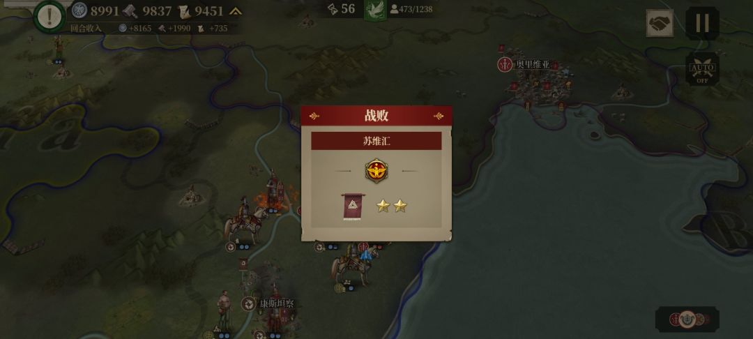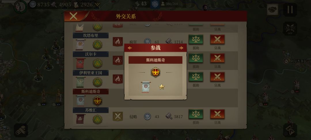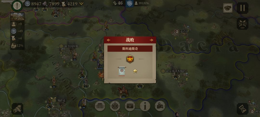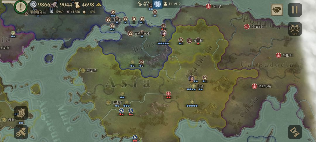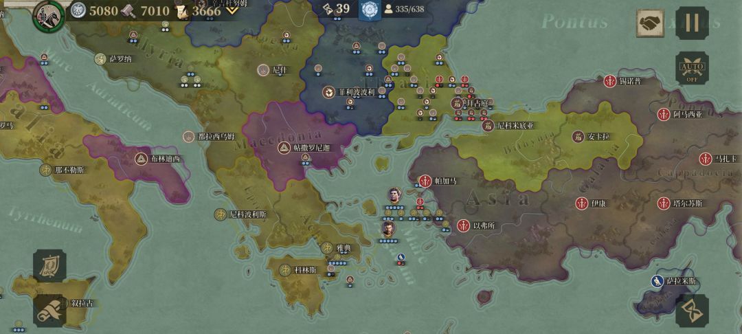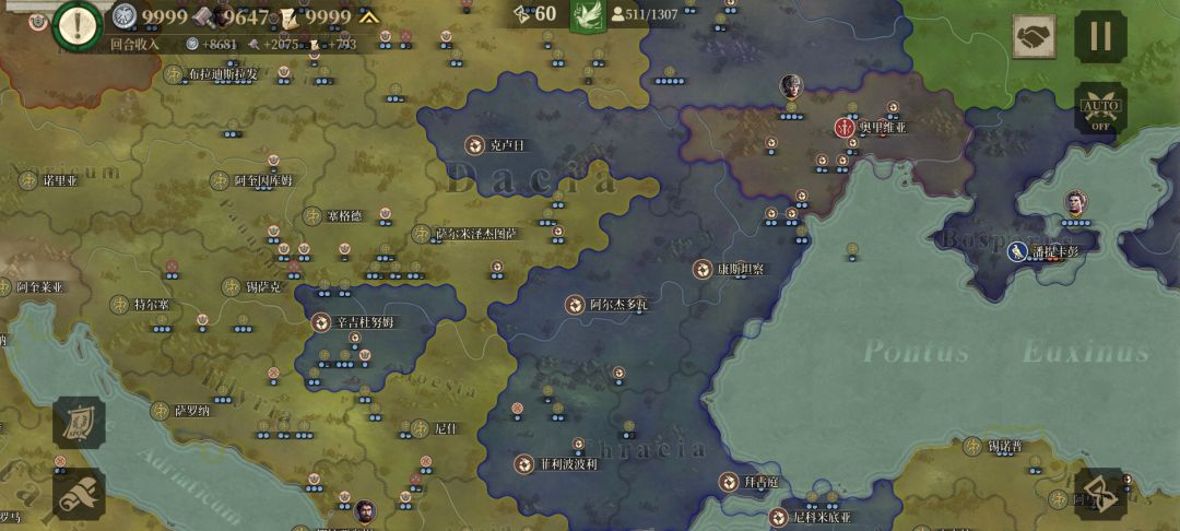 2、我决定对这两个盟友斯科迪斯奇、苏维汇宣战,前者由于我宣战,我挑动的中立国赶来支援我了,还占了一座城(我后面宣战了它,占领它主要土地,另一块想去吃,但被盟友达西亚王国(三星国)吃掉了。我之所以没有宣战达西亚,是因为它主要兵力一直抵住罗马 克拉苏往我本土渗透,还在我打到这片区域时,与我交相辉映,它的兵和我的兵挨得近,我就没有宣战,要不然既降低最主要战场环黑海地区的速度,还得专门调兵打一个多余的敌人,麻烦。);后者,我宣战后,还在日耳曼尼亚附近正在“散步”的盟友小兵前来支援我,占了两座城使我未获得日耳曼尼亚全境(游戏地图),亚平宁半岛一小块城镇未得到,但我基本上的土地已经拿到,就默认了。我之所以没选择对那两个盟友宣战,是因为他们的大后方在伊比利亚半岛,我鞭长莫及。