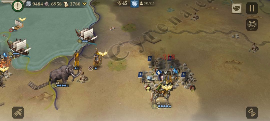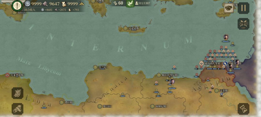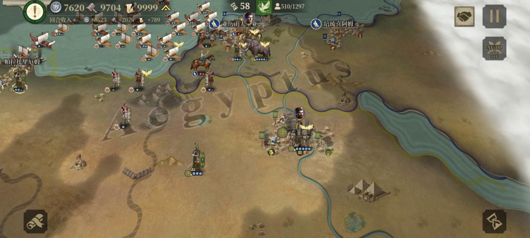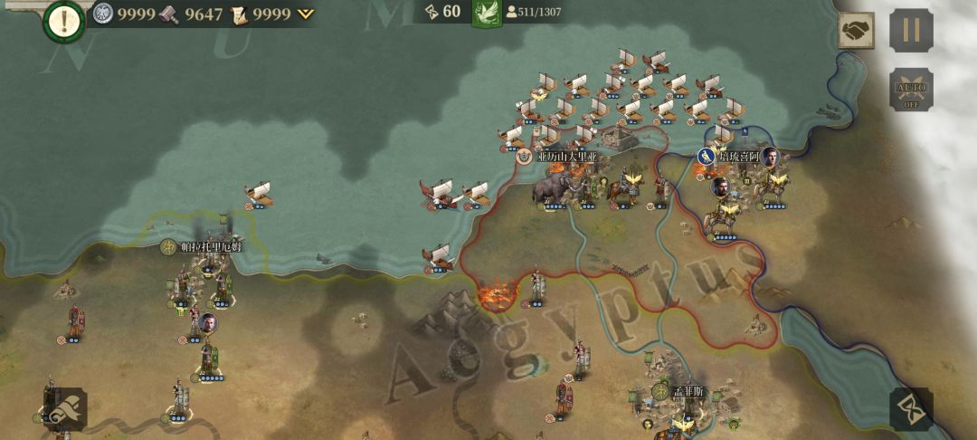 3、我的北非方面以迦太基为大本营,与盟友的配合下,灭了罗马 庞培最后一个据点,并歼灭了两个埃及将领带领的军团,顺利挺进到埃及王国的上埃及地区(游戏地图,而且以尼罗河为界,上尼罗河的埃及称为上埃及,反之,下埃及地区。)我方占领了其都城—孟菲斯,但由于我把步兵落在最后、未及时跟进骑兵的进攻矛头,在与盟友配合下,没拿到亚历山大港、培琉喜阿姆两个港口(我只是想要个亚历山大港,有政治、经济两个收益。)
