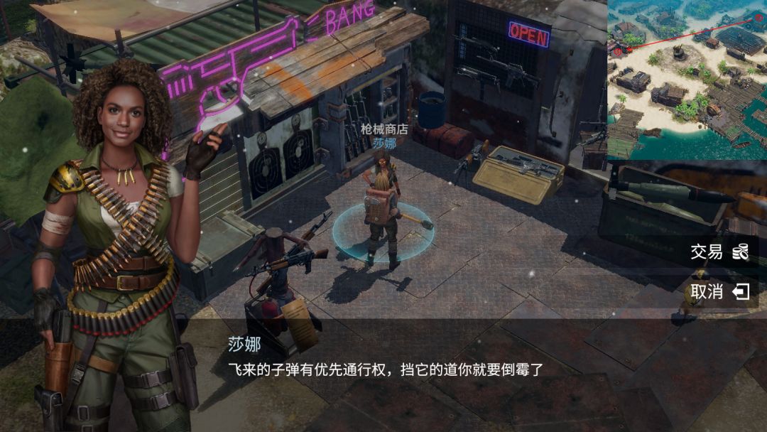 莎娜:“非常火爆!开工之后大家对火力的需求突然就变多起来了。陨铁盟和离岸会又再争抢什么东西,听说是某种神秘的矿石。看起来我是时候再进一批重火力武器了,他们说RPG的火力还是略有不足。”