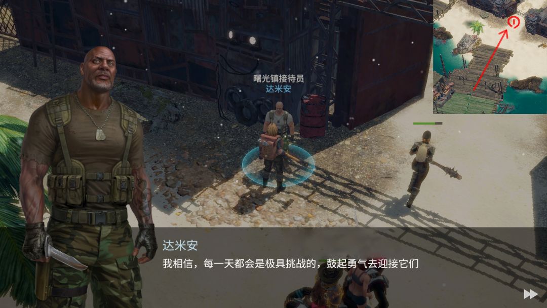 首先我们沿着地图的①号标记就可以走到曙光镇的正门,迎面而来的便是每个玩家初到曙光镇都会认识的曙光镇接待员——达米安先生