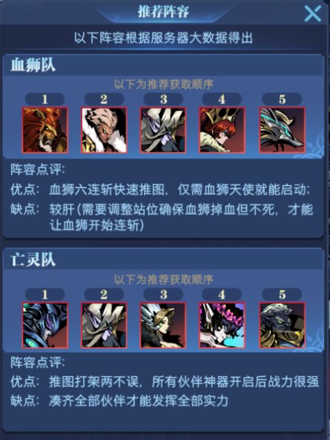 这个是官方根据玩家大数据给出的两种配队路线,血狮队其实更多被叫做国家队,与亡灵队各有优劣。现在最受好评的是兼顾两种路线的阵容搭配,即以血狮为核心、亚瑟为副C、天使作为血狮固定挂件的亡国队,根据地图中怪物的攻击手段,以色欲针对AOE阵容、风语针对需要秒后排的阵容、元素针对肉坦阵容、女皇针对血狮一波流阵容,进行灵活搭配。