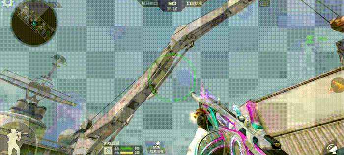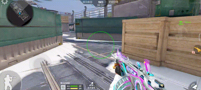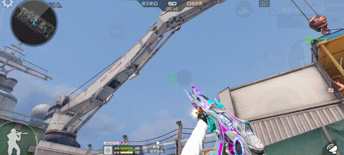 这款武器尾部有一个大大的圆环,装备皮肤后的圆环会有一个“接触不良”的光效。配合上这个奇妙的色彩,都能感觉出一丝丝赛博朋克风味了。不仅如此,枪械顶端的枪管处也是同样的效果。