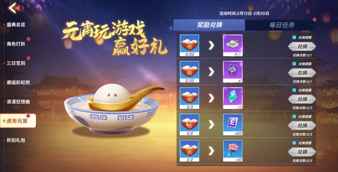 2月12日至2月20日,少年们完成任务可以兑换超多奖励,最高可得限定永久道具卡皮肤:时光机·小小汤圆皮肤哦!
