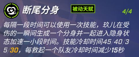 玖儿在受伤的一瞬间生成一个分身并一起进入隐身状态加速一小段时间。每救起一个队友减少一定的冷却时间。