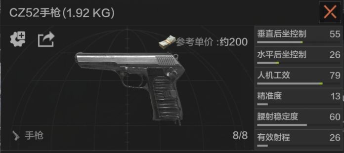 CZ52是终极测试中新增武器的一把手枪,与T54一样使用7.62x25毫米口径弹药,两者的基础属性相差无几。由于目前没有可使用的配件,CZ52是无法通过改装加瞄具,只能使用默认的机瞄。8发子弹的原厂弹匣的续航能力也很有限,通常只能用来对付一下普通游荡者,建议仅开荒使用,有更好武器后将其换下。