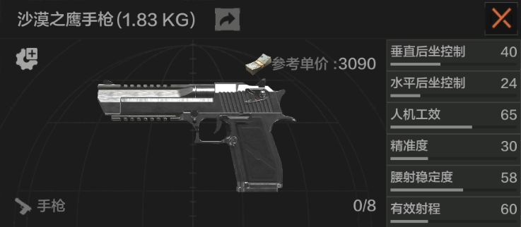 先说说手枪的优点吧。首先,手枪的价格是相当低廉的。比如很受先锋欢迎的手枪沙漠之鹰,使用.44口径子弹,威力惊人,但在市场上的价格却与入门级的冲锋枪差不多。一些更便宜的手枪甚至不到千元,这对于初入暗区、囊中羞涩的先锋们来说就具有很高的性价比了。