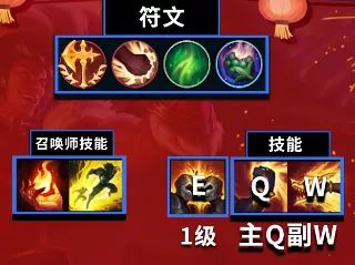 符文选择方面,我们选择征服者、残暴、复苏之风和甜食专家。召唤师技能选择引燃闪现。加点选择主Q(1技能)副W(2技能);一级点 E(3技能),二级根据情况选择Q(1技能)/W(2技能);打爆发高的英雄或者长手二级点W(2技能),有优势时点Q(1技能)来打伤害。