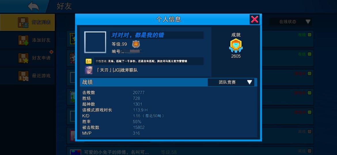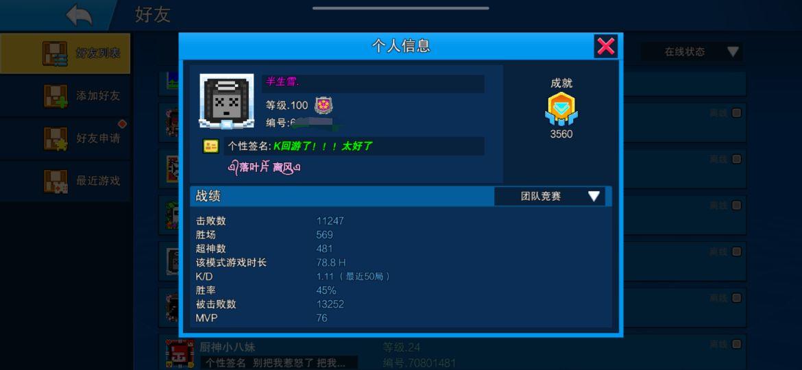 还有,就是我玩一个刷钱机地图,发现一个4颗黄星的人是自动加喷苟,我礣了他两句,然后之后打完我加他好友,要单挑,之后我在我发出的申请里没找到他,说明他应该同意了,但是我在好友列表里没发现他,倒是有个好友把名字改成了对对对,都是我的错,我怀疑是他,他俩名字的色号都一样