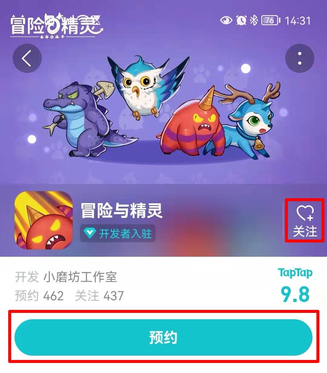 在游戏正式上线之前,点击“预约”并“关注”《冒险与精灵》的玩家,在游戏正式上线后均可获得一份“预约答谢礼”