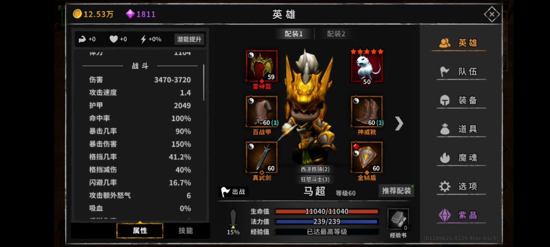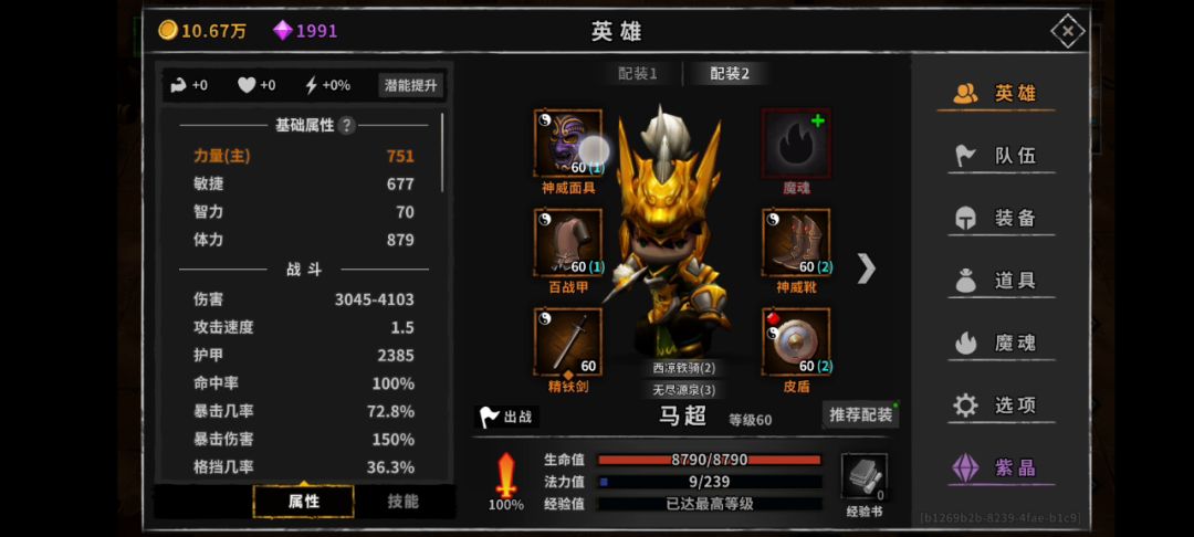 装备和魔魂都是传统的暴怒马超,只是技能设置不一样。技能设置43好处是开局能自怒,而且打高层可以隔一回合放大拉条,特别是带夏侯渊打条,光靠夏侯渊自己是打不下来条的,必须还要有人拉条。