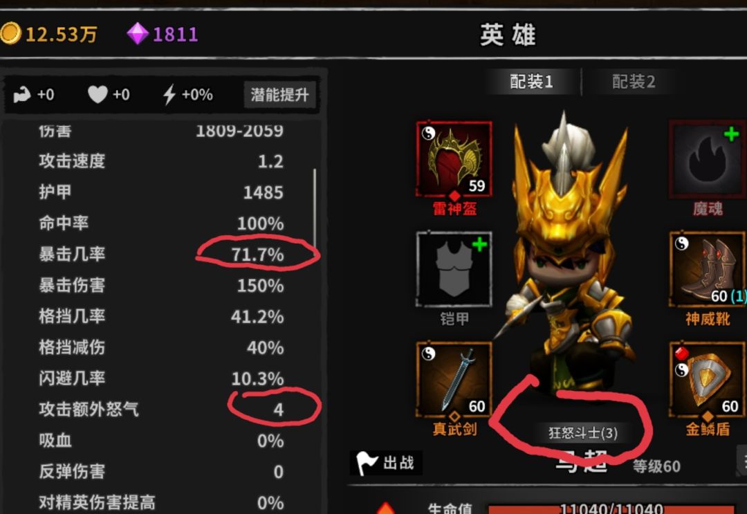 由于装备只需要2件回怒装,所以可以带3件小攻速装,加上只需要70暴击,大词条可以打两个,马超专属1.3攻速。所以理论上可以2.0攻速。