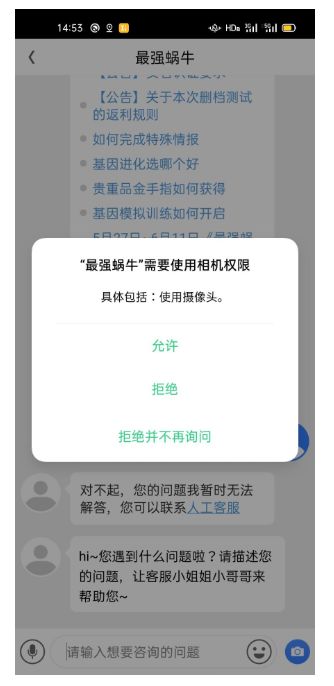 3、【相机权限】用于在游戏内联系客服时向客服发送拍摄的照片或视频,将在游戏内联系客服需要拍摄照片或视频时询问是否同意获取权限,若不同意,将无法拍摄照片或视频发送给客服。