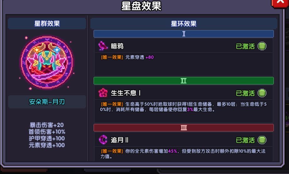 星群选择安朵斯月刃,如果是毕业玩家,可以选择不要星群,三环驲,二环月,一环乌鸦