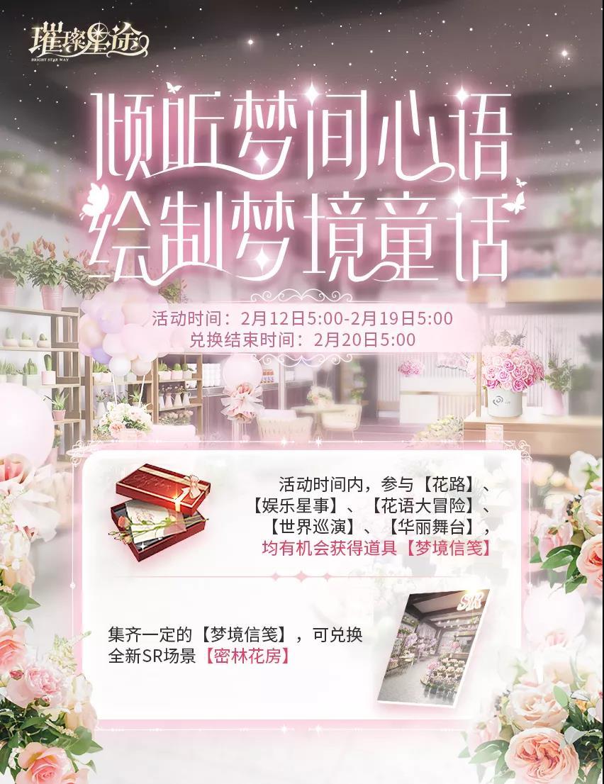 (奖励兑换截至时间 2 月 20 日 05:00 )活动说明:活动时间内,参与【花路】、【娱乐星事】、【花语大冒险】、【世界巡演】、【华丽舞台】,均有机会获得道具【梦境信笺】!集齐一定【梦境信笺】,可兑换