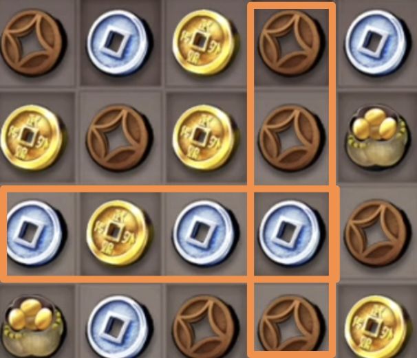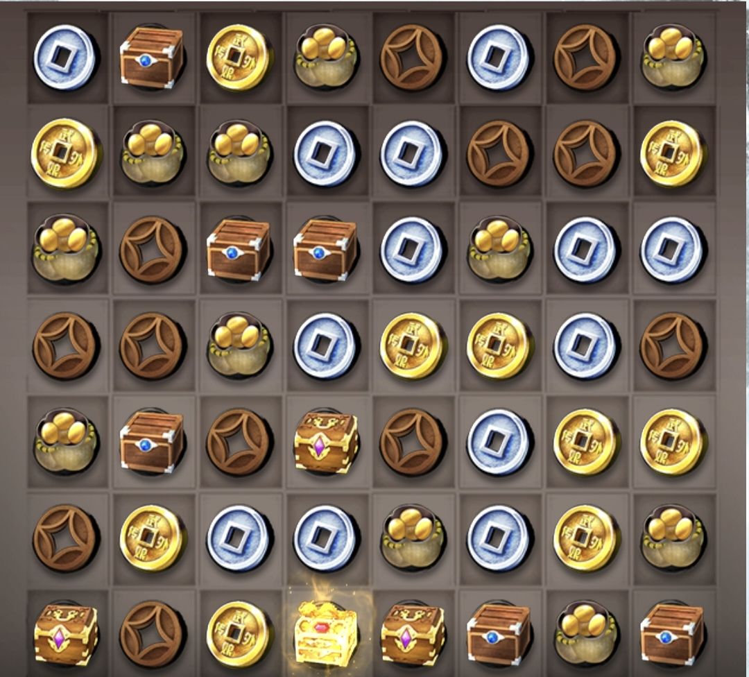 我们可以选择用步数把底下两层的棋子尽可能配对消除,优先级是铜币>银币>金币>箱子,以此增加上方的有效棋盘空间。