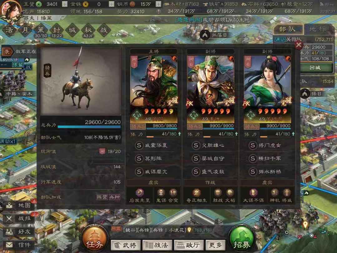 本队武将质量非常的高,差不多桃园、蜀骑弓、关妹,这些阵容各来一个代表,非常地有排面,且都是三战中蜀国的精英武将。这里选择让关羽主将,发挥更高概率的控制能力。