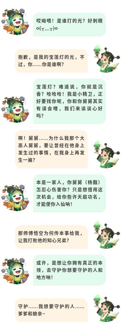 动画片《宝莲灯》讲述的是一个敢于反抗传统,勇于向上的精神。沉香会激起人们心中敢于反抗的心,处于链接时沉香受到伤害后队友有10%的概率使用普攻进行反击。