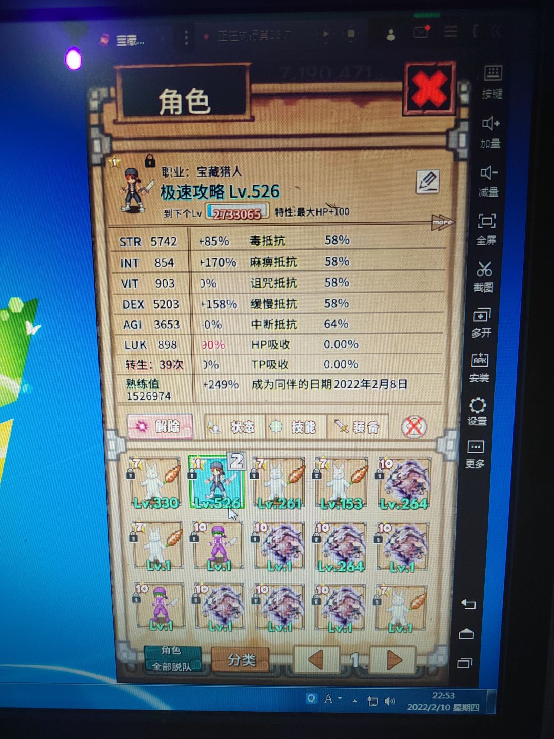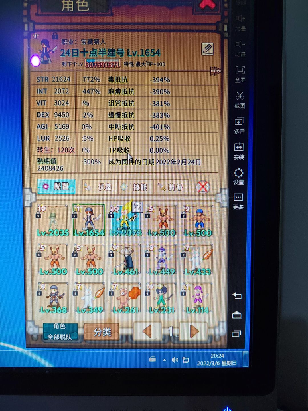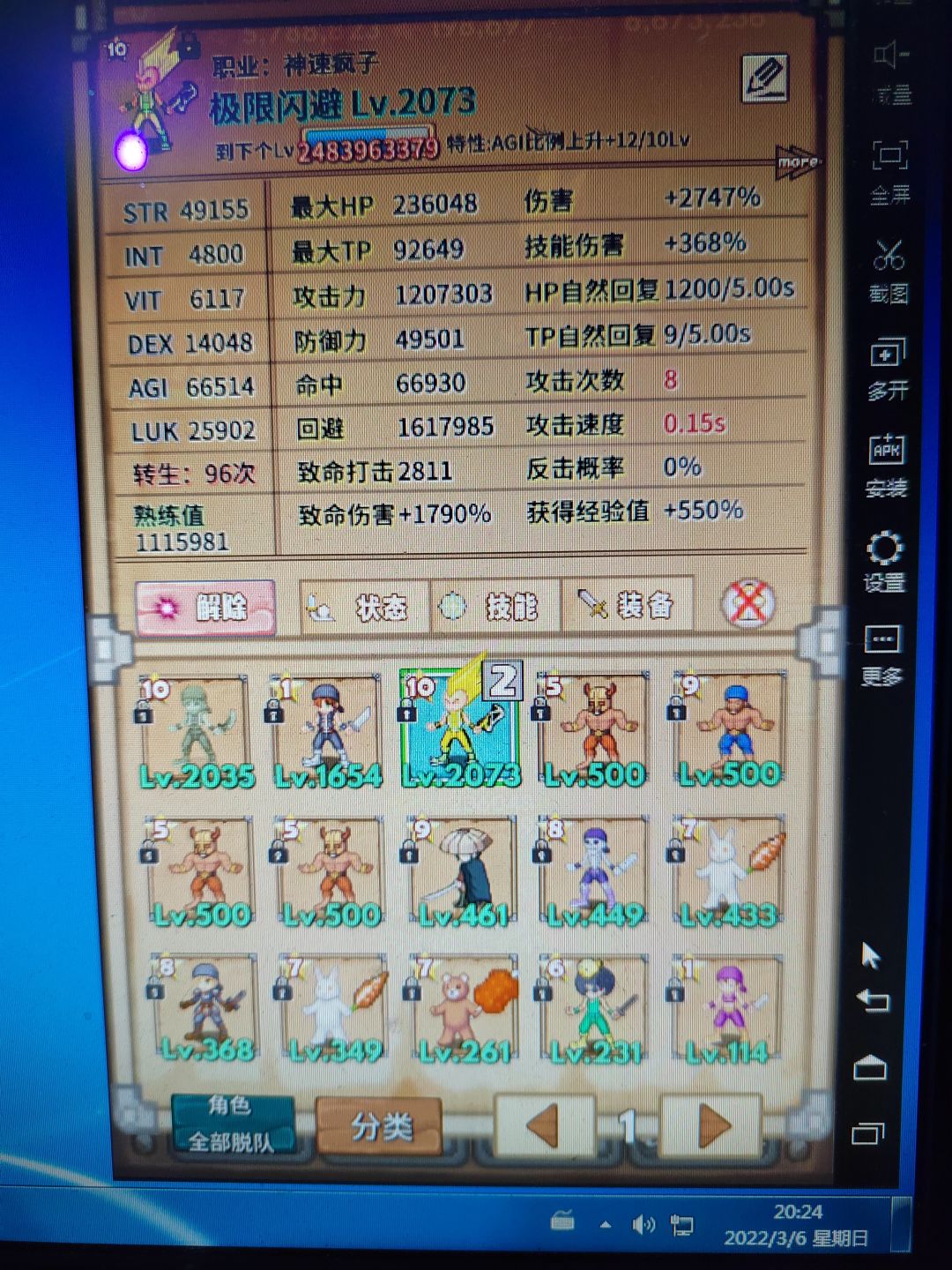 3、当恐怖爱人转生技能全部完毕后(可不加AGI),手机挂等级,电脑连点器刷图书馆至B层,刷一把OP心怡的“神速闪”,推荐STR、AGI、LUK、DEX等随等级提升的,或是最终伤害的,均可。将其带给有容量提升的角色,练熟练度。