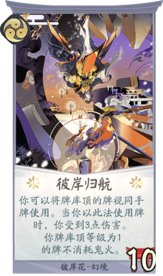 彼岸归航可以将牌库顶的牌视作手牌使用,让我方可以使用更多卡牌,但会对牌手造成3点伤害。若该预先使用的牌等级为1则不消耗鬼火,能为我们节省更多的操作空间。