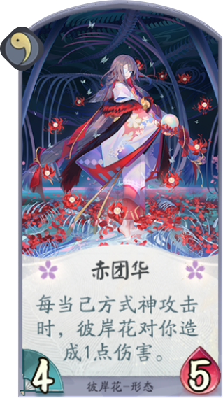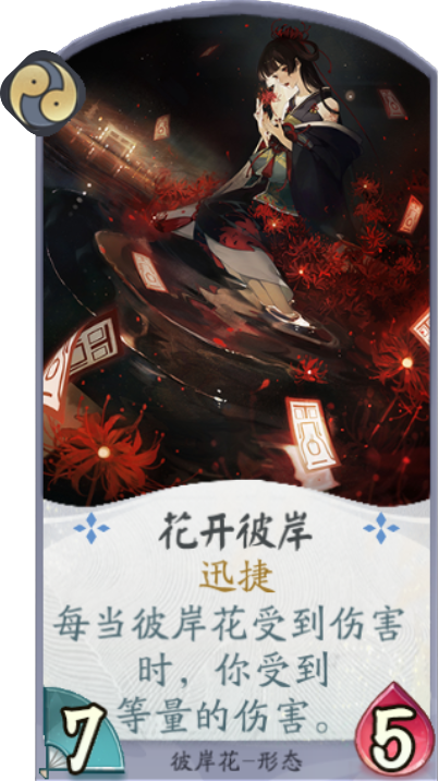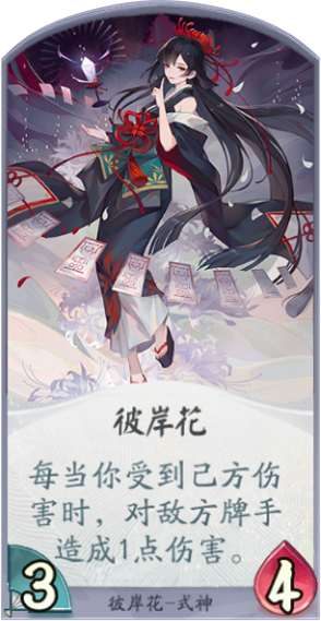彼岸花是一位以负面效果交换正面收益的式神。当牌手受到己方伤害时,会对敌方牌手造成1点伤害,可以与自身幻境牌配合打出更好效果。