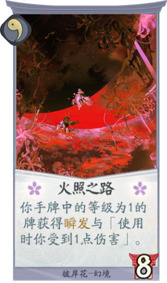 火照之路使手中的1勾玉牌获得瞬发效果,但在使用时牌手会受到1点伤害。合理利用效果有利于己方在前期打出优势。