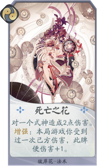 死亡之花在对式神造成2点伤害的基础上,会根据自身牌手受过己方伤害的次数而获得相应的伤害增加。与彼岸花基础能力配合,可以不断叠加伤害用于解场。