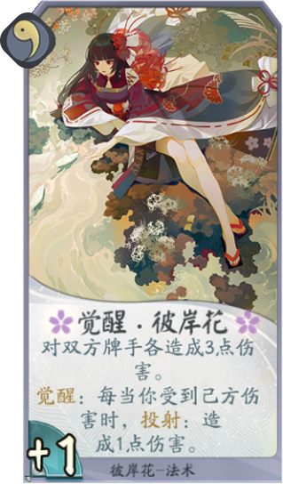 觉醒·彼岸花入场时会对双方牌手造成3点伤害,而基础能力中指定对牌手伤害会改为投射1点伤害,使用时需要根据敌我双方阵容选择该牌的入场时机。