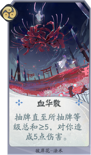 血华散的过牌数量基于所抽牌的总等级计算,所以当牌库中平均勾玉等级较低时能提高过牌张数。在提高过牌能力的同时也会对牌手造成5点伤害。