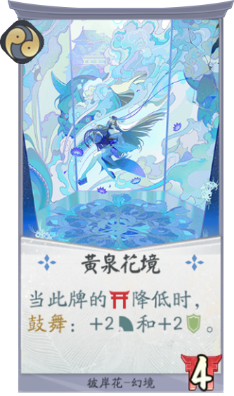 黄泉花境配合彼岸花的基础能力,能够提供鼓舞效果,额外获得2点攻击加成和护盾加成,提高了我方站场时的进攻能力和自保能力。