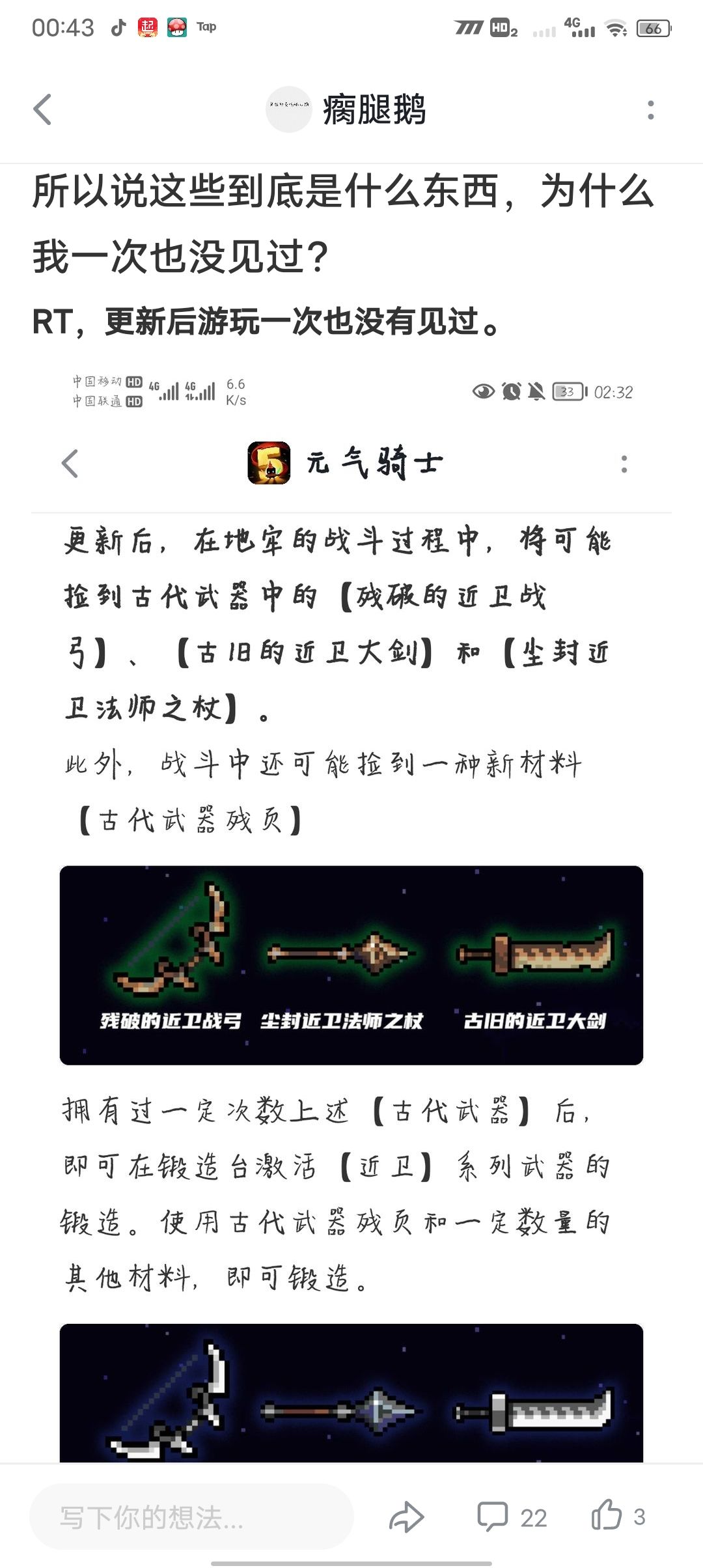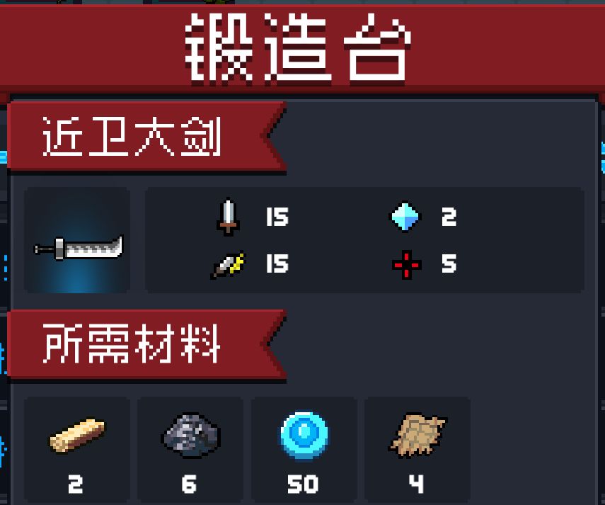 近卫大剑是古代近卫大剑的升级版,摸了八次古代近卫大剑就可以在锻造台直接锻造,成本不高,需要2木材6铁矿和4个古代残页。