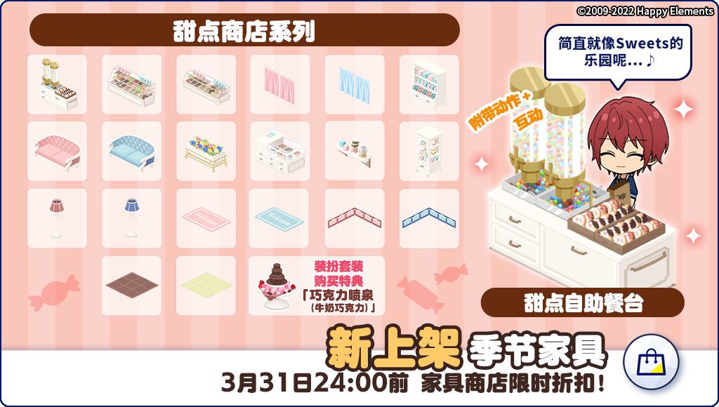 事务所家具商店追加「甜点商店系列」,限定家具附带动作+互动,同时装扮套装还会获赠特典家具「巧克力喷泉(牛奶巧克力)」!