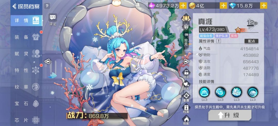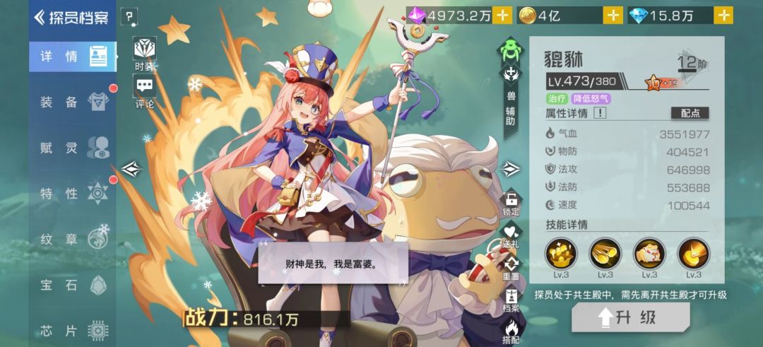 2、敲黑板,划重点!!这是机制最大的问题来了,就是基础速度,请看我下图辅助们的速度,洛可可是靠速度叠顺风吃饭的,看看渣女的基础速度9.3万(推荐加点还加了78点)对比全血加点、全血加点、全血加点(重要事情讲三遍)的辅助们速度低多少?我贝壳17万,这货叠满了10层顺风,加了50%速度,也就14万左右。如果没有法术连击,是不是叠被动需要10个回合?那你想叠暴击,还是叠连击?没自保能力还要不要叠点免伤?