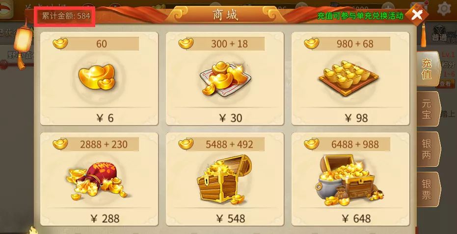 单充兑换额外赠送元宝。