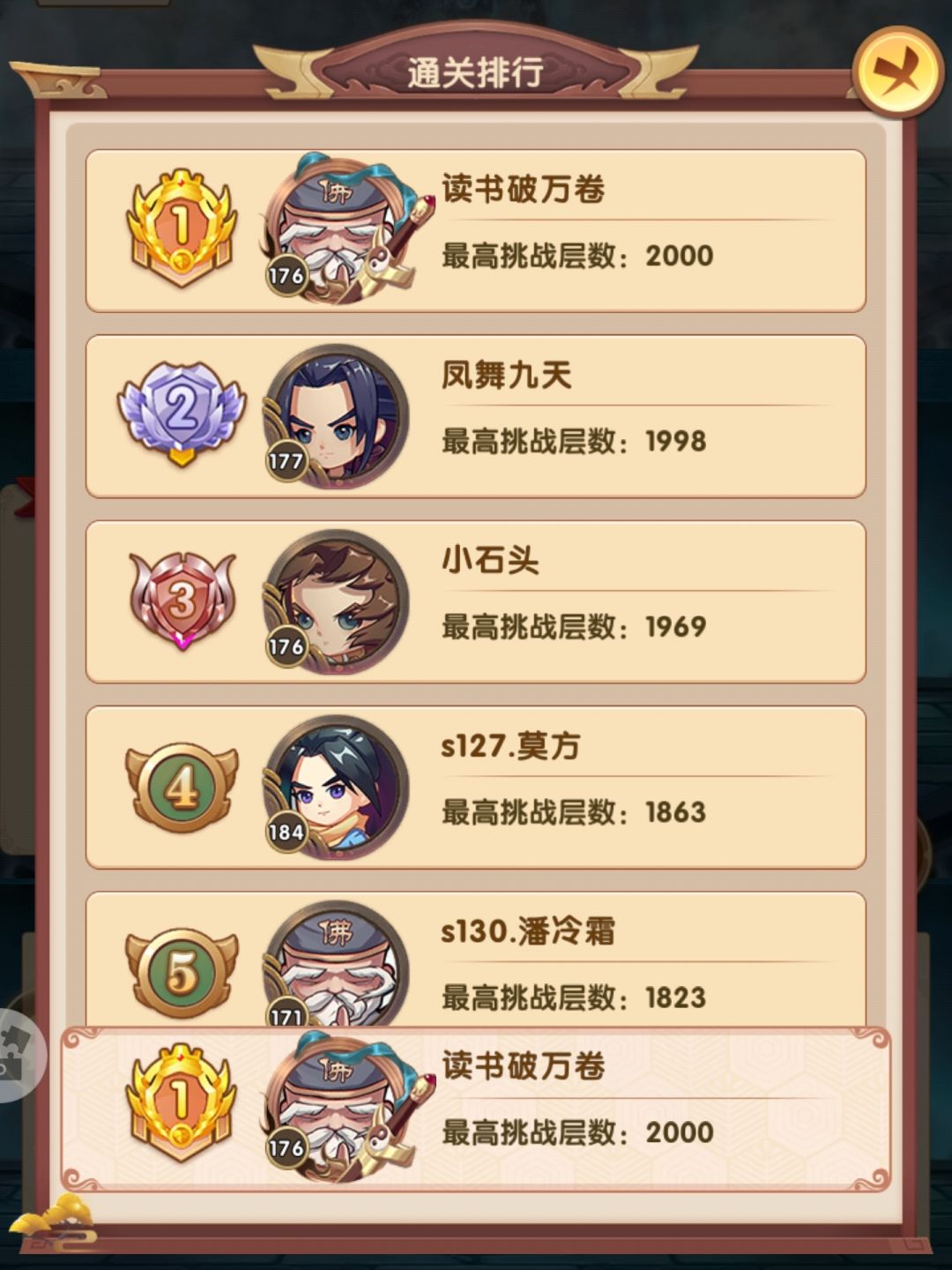 没错,就这一个阵容,从1680层一路无脑打到2000层,包括:站位、阵法、绝学,搭配好以后,中间根本不用更换,就一路站到底。