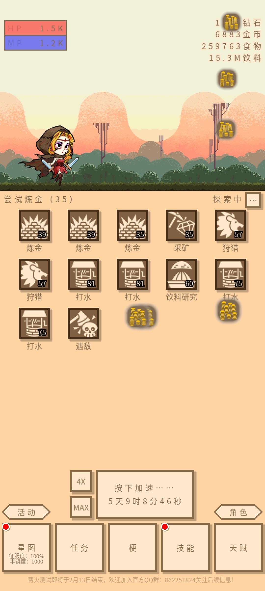 个人游戏思路,打金币,打水,金币最重要,金币可以买游戏加速时间,1个金币加速1s。前期自己打几个boss(星球),自己搭配一套卡,能维持水就行,食物多少有点(不是用来加血,用来加技能经验)。然后一直开max加速,金币去商店买东西,点8号按键位置,一直点就行。买的东西是什么不需要看(前期啥不够买啥,后面金币多一直买就行)。
