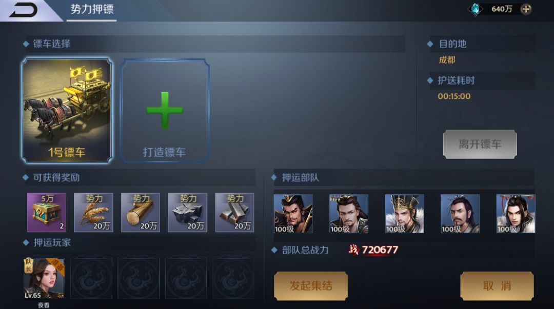 势力押镖需要五人满队伍后,才可开始押镖。故当选择镖车、设置押镖队伍、点击准备后,需等待势力成员的加入;此刻玩家可点“发起集结”按钮通过势力聊天频道,通知其他势力成员参与押镖任务,以便提升队伍集结的效率。