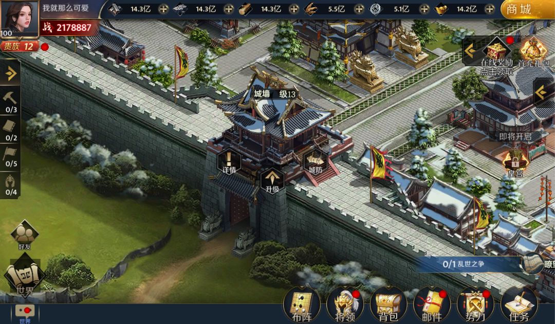 如图,城墙需要升级,等级越高,城防设施数量越多,设施的防御和攻击能力越高;则被玩家攻击时,可进行的防御次数和能力越强。