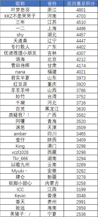 从第三名起,选手们的分数差距可谓“差之毫厘,谬以千里”,第三名来自浙江的“天下”选手较第四名仅有22分的微弱优势,希望排名稍低的选手们都能继续加油!