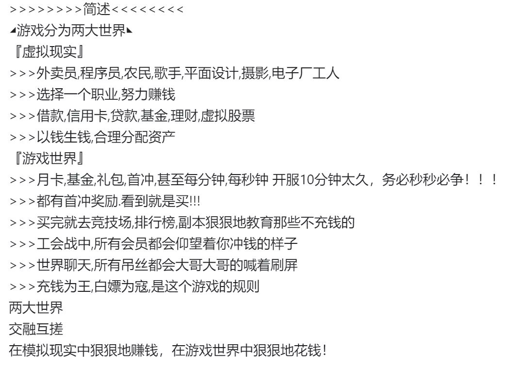 但是当你打开游戏的简介就会发现,其实这是一款讽刺过度氪金的免费游戏: