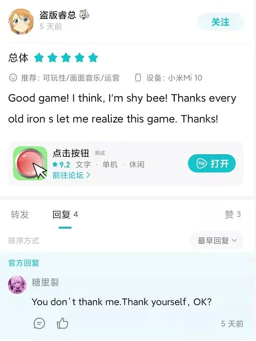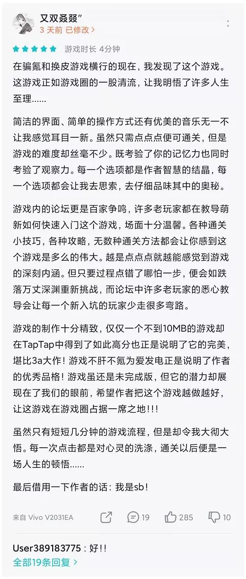 有点好奇这个从名字到图标都透着一股放弃治疗味道的游戏到底为啥分数这么高,就看了看 Tapper 们的评价,看到评价内容之后我不禁陷入了沉思:难道国产游戏的春天要来了?
