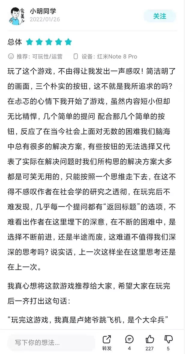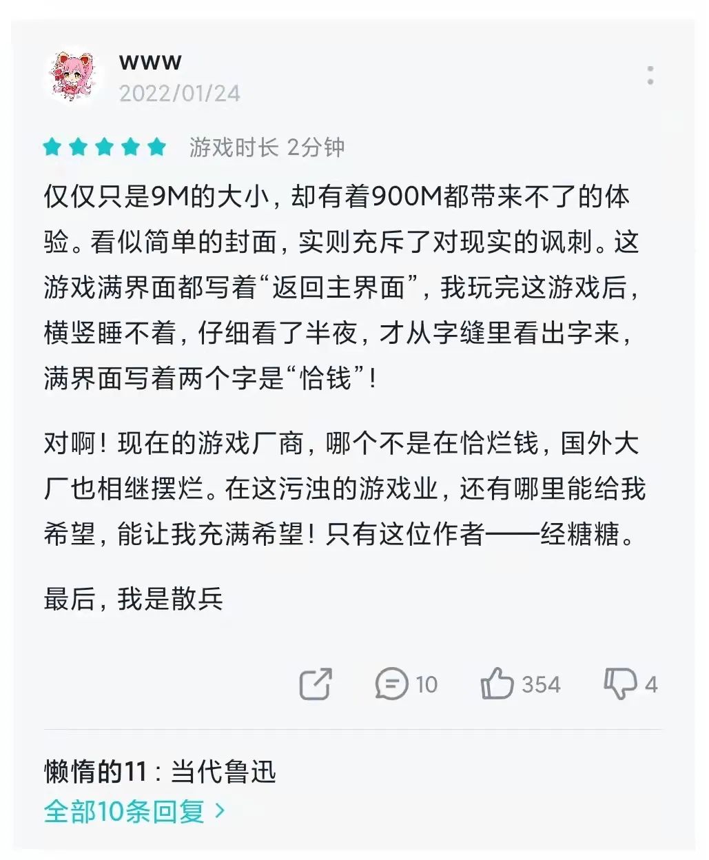 要不是看到了最后一句我还真以为遇到了隐藏的神作了,我觉得比起游戏本身,这游戏的评价区才是最精彩的地方: